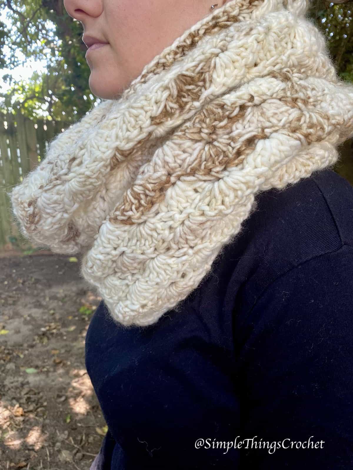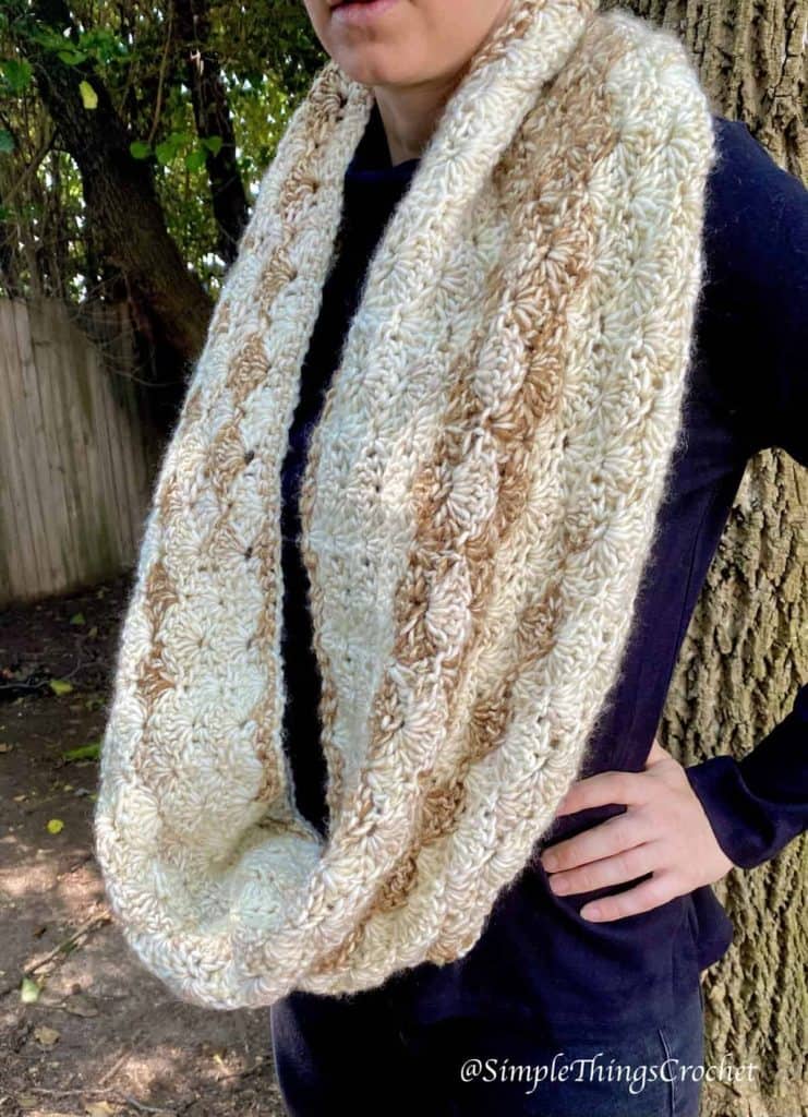 This Caramel Latte Infinity Scarf is super easy, super warm, and super versatile. What more could you ask for in a beautiful piece of crochet work? I love it as a scarf, but with a single twist over your head you have a gorgeous bulky cowl! Two great looks in one awesomely warm scarf.